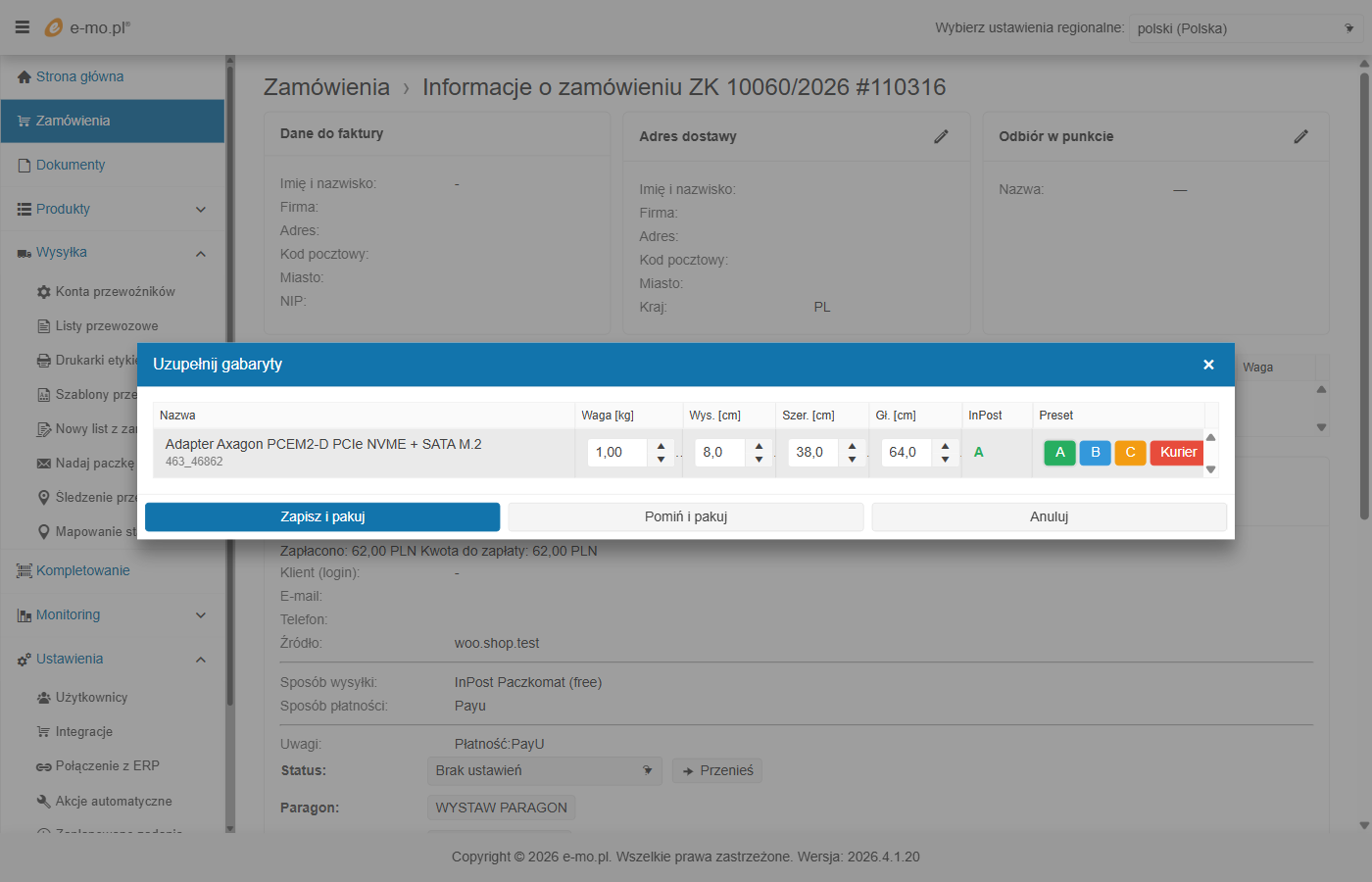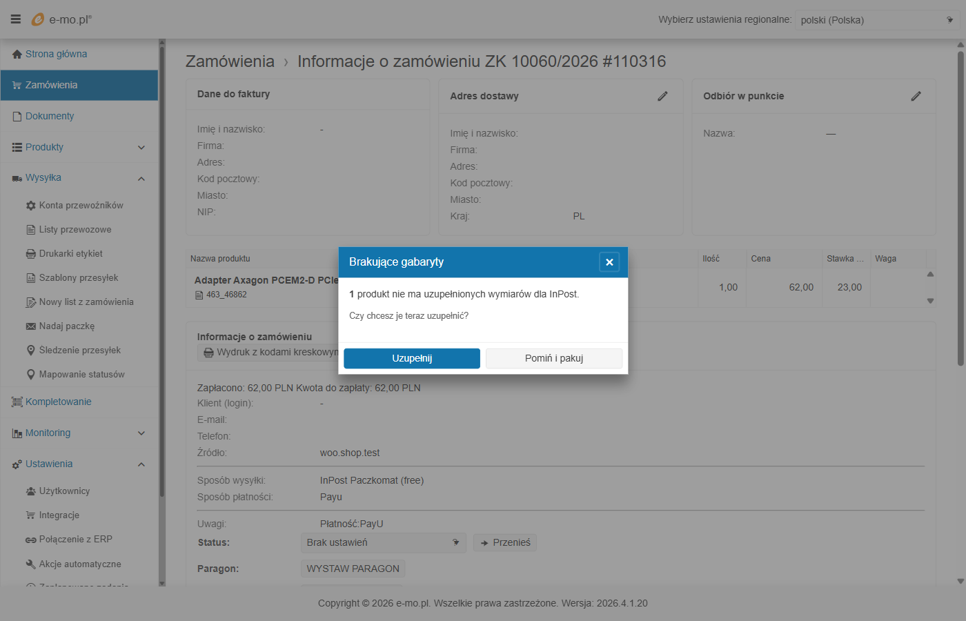 Po wejściu w szczegóły zamówienia i kliknięciu przycisku Utwórz list, system najpierw sprawdza, czy produkty w zamówieniu mają uzupełnione wymiary i wagę. Bez tego nie da się prawidłowo wybrać rozmiaru paczkomatu.