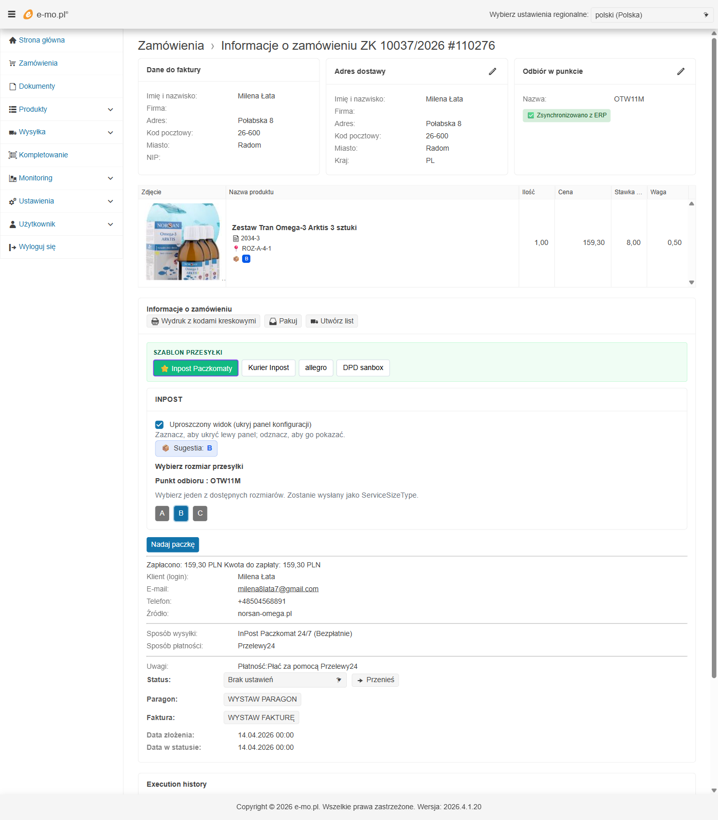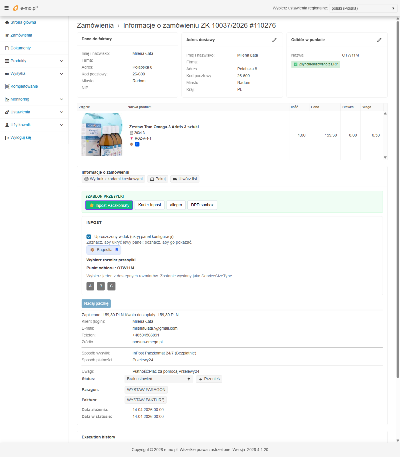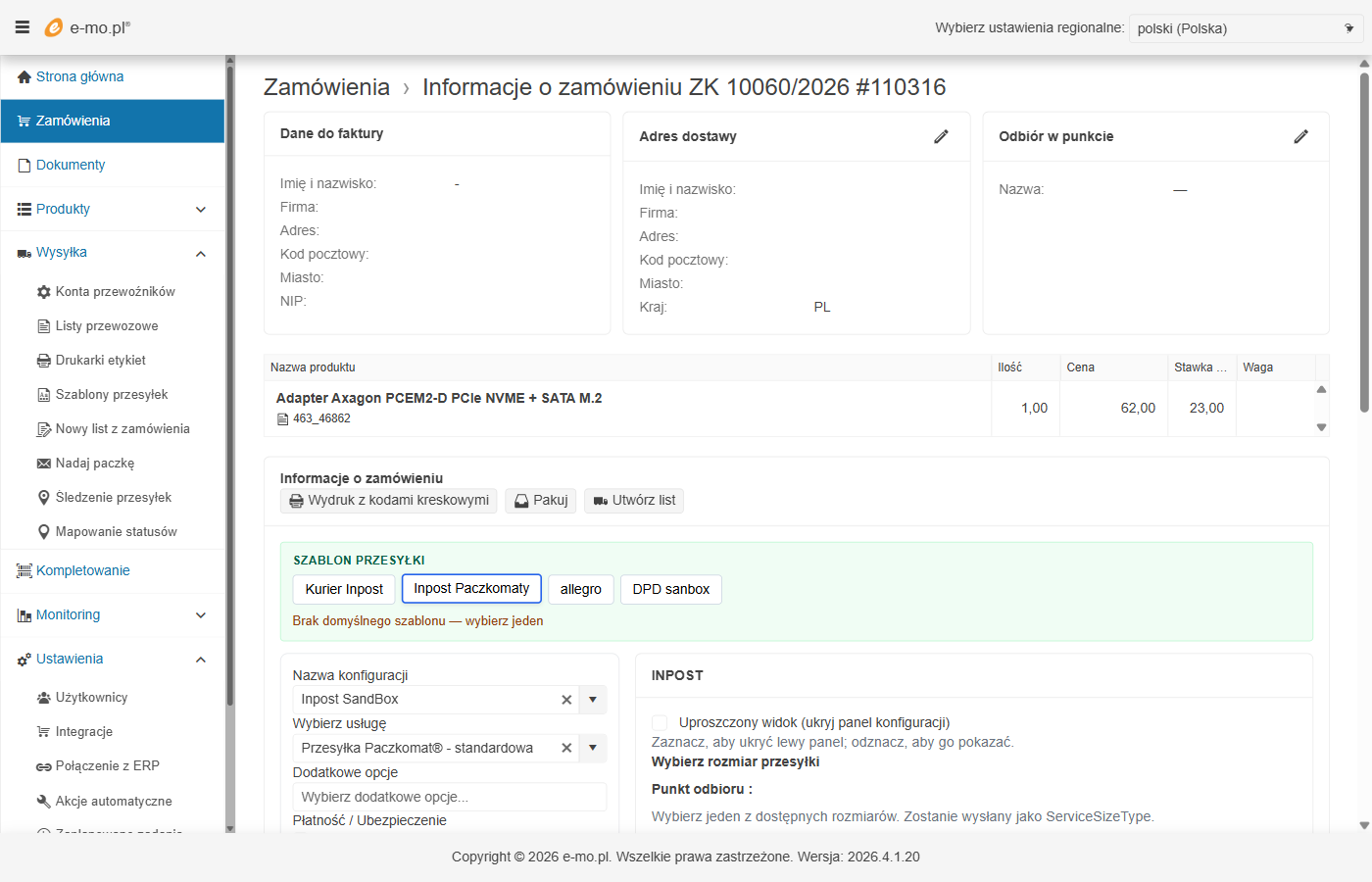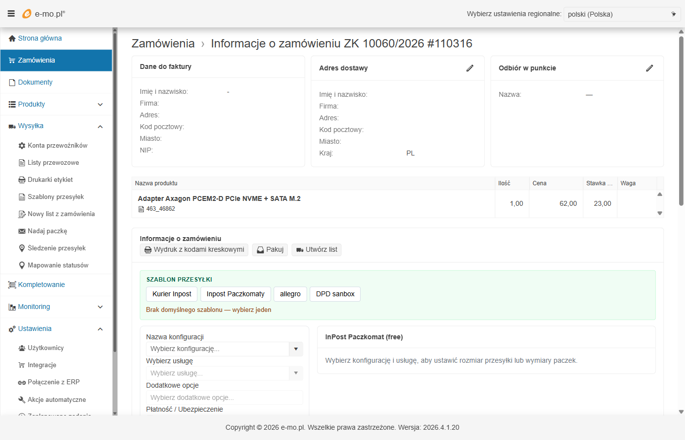 s2s WebAPI monitoring pamięć certyfikatyKrótki przewodnik pokazujący, jak w emoms wystawić list przewozowy — na przykładzie paczkomatu InPost. Cała droga prowadzi przez cztery ekrany: konfigurację przewoźnika, szablony przesyłek, szczegóły zamówienia i wygenerowanie etykiety. W praktyce po pierwszym ustawieniu, codzienne nadanie paczki to dwa kliknięcia.