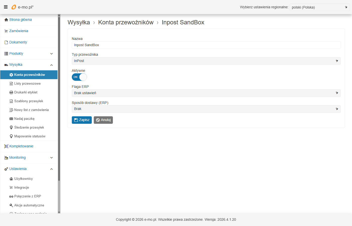 Pięć prostych pól: Nazwa (widoczna w aplikacji), Typ przewoźnika, przełącznik Aktywne, Flaga ERP i Sposób dostawy (ERP).