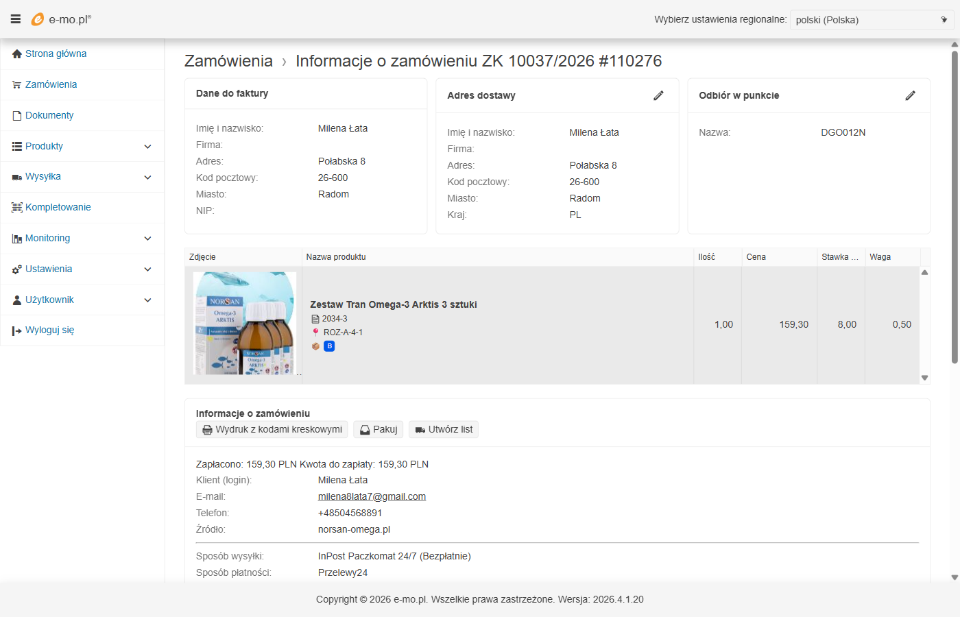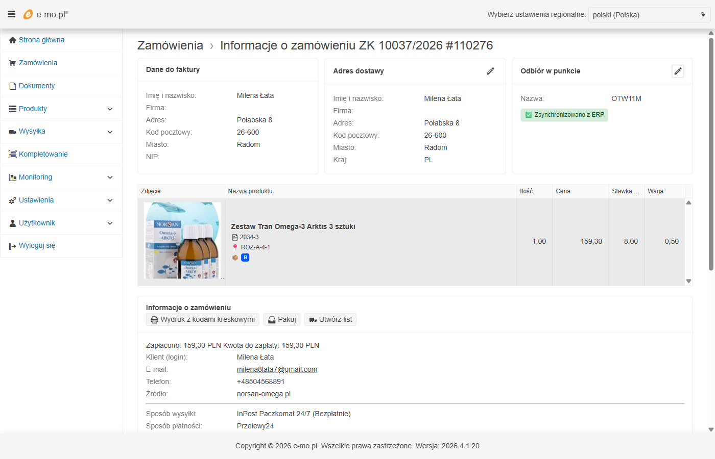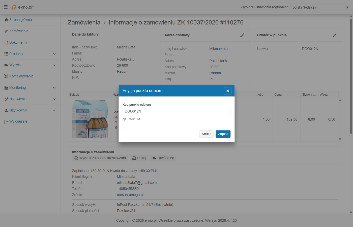 Paczkomat wybrany przez klienta (np. OTW11M, RAD19M) trafia do emoms razem z zamówieniem. Czasem jednak trzeba go zmienić ręcznie — klient się rozmyślił, paczkomat jest uszkodzony, albo sklep nie przesłał kodu.