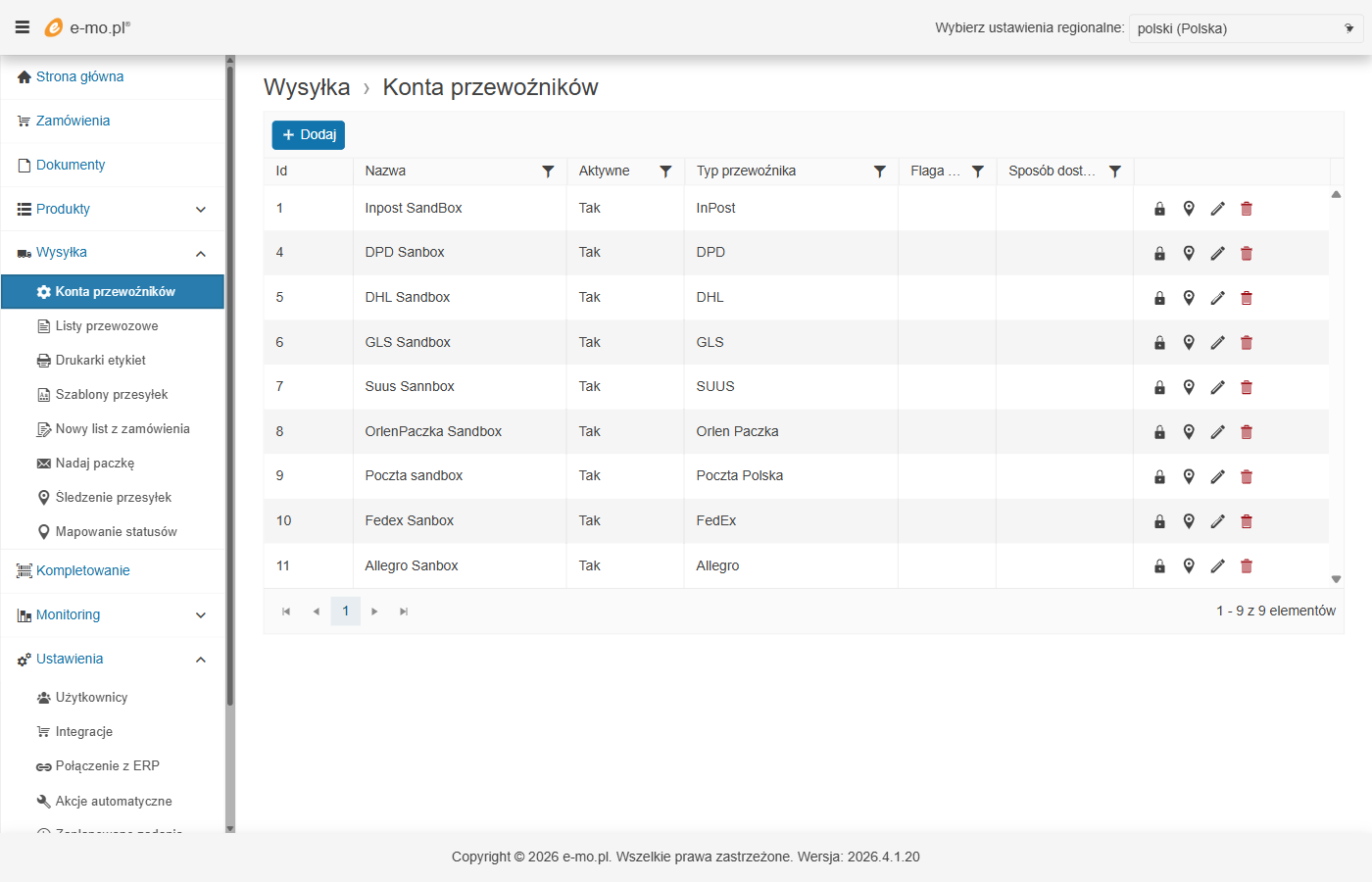 W menu Wysyłka → Konta przewoźników zarządzamy integracjami z firmami kurierskimi. Każdy wiersz to osobne konto u przewoźnika. W przykładowej instalacji widać dziewięciu operatorów: InPost, DPD, DHL, GLS, SUUS, Orlen Paczka, Poczta Polska, FedEx oraz Allegro.