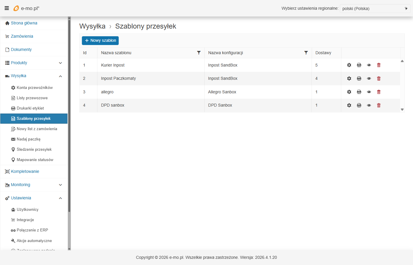 Przykład: cztery szablony — Kurier Inpost (przypisany do 5 sposobów dostawy ze sklepu), Inpost Paczkomaty (4), allegro (1) i DPD sandbox (1).