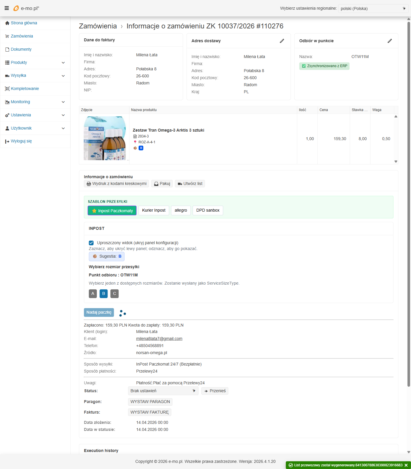 Klik w „Nadaj paczkę" — emoms wysyła zlecenie do InPostu i w ciągu sekundy dostaje numer listu. W prawym dolnym rogu pojawia się zielone powiadomienie: